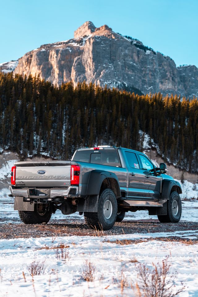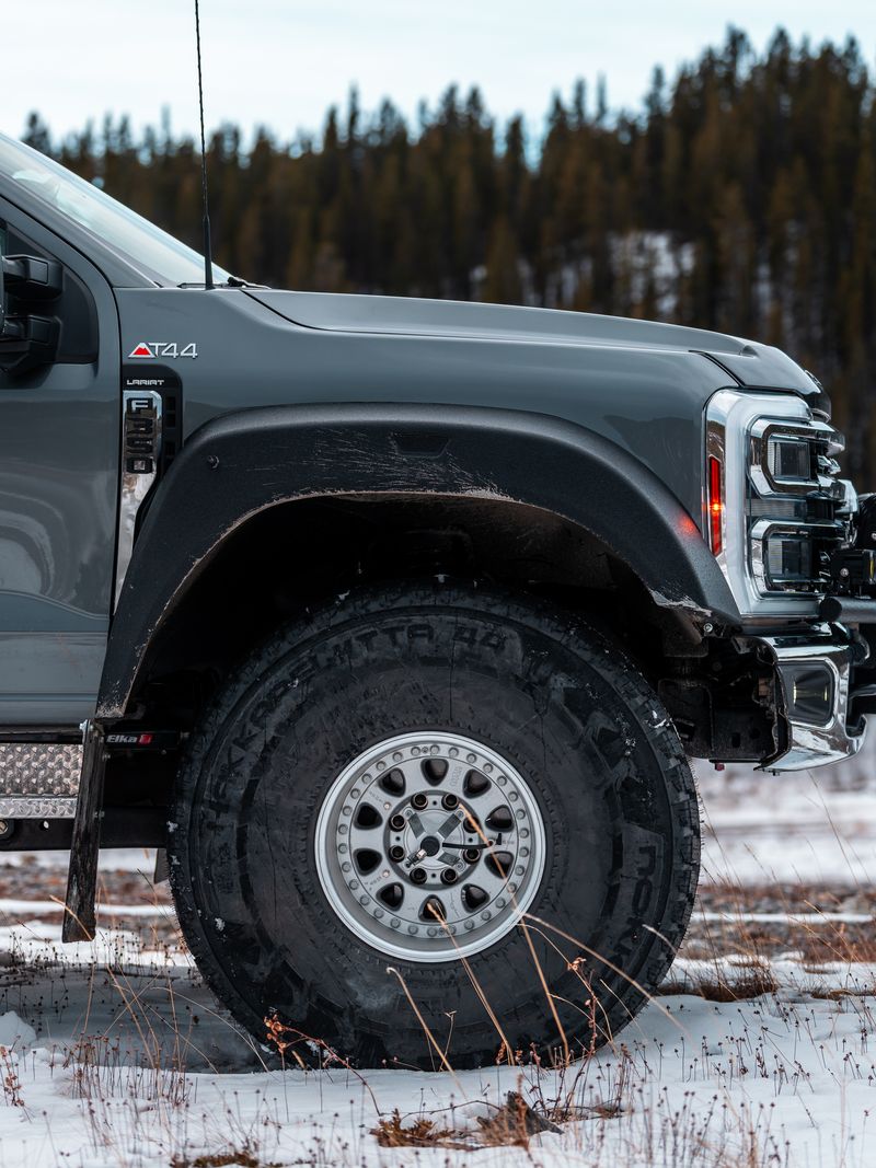 Click HereBased on a Ford F-350, the truck received Arctic Trucks’ full AT44 conversion, including suspension, extensive body modifications, custom fenders, three-piece aluminum wheels, and massive 44” Nokian Tyres tires. It’s also equipped with a CTIS (Central Tire Inflation System). The 7.3L gas engine paired with factory 4.30 gearing has no issue turning the large tires, and we added a front limited-slip differential to further improve traction in extreme conditions.