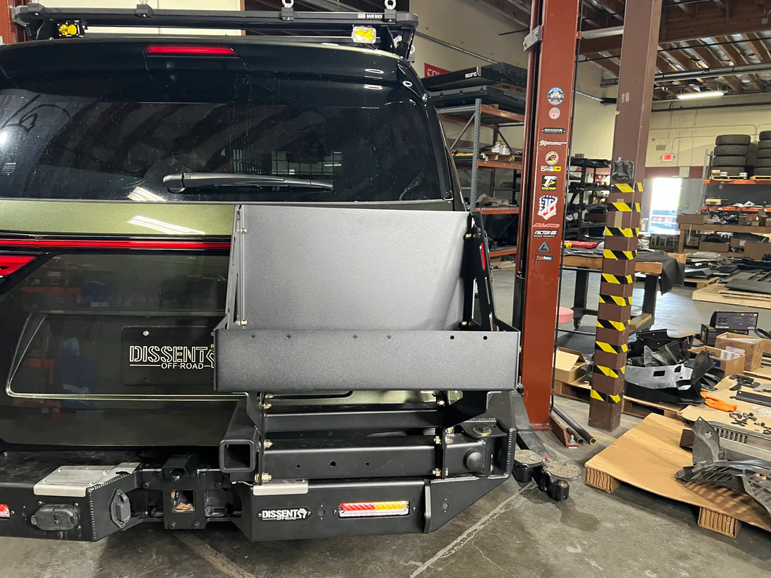 The Triple Jerry Can Basket Swing-out is largely based on Dissent's Tray Swing-out but features higher sides and back to secure three jerry/NATO fuel cans. This accessory features a secondary hitch receiver that allows you to mount a hitch accessory to the swing-arm like a bike rack. (note: not recommended for heavy items like multiple E-Bikes)