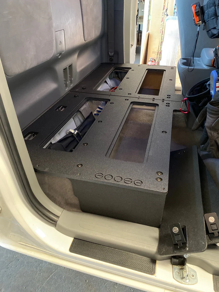 The second row seat delete system is designed to create a flat platform that you can use to secure your gear, for the dogs bed and can also be used to store your refrigerator or cooler.
