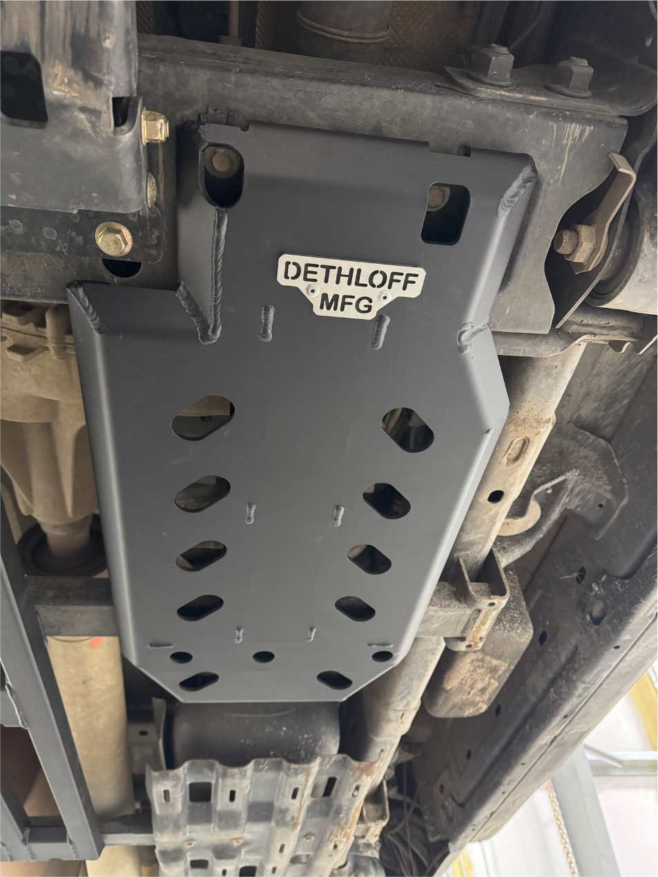 Developed as a substantial improvement over the thin and unreinforced OEM t-case skid, the Dethloff skid plate offers an increased area of protection and adds coverage over the previously unprotected emissions evaporative canister, all in an incredibly robust package.