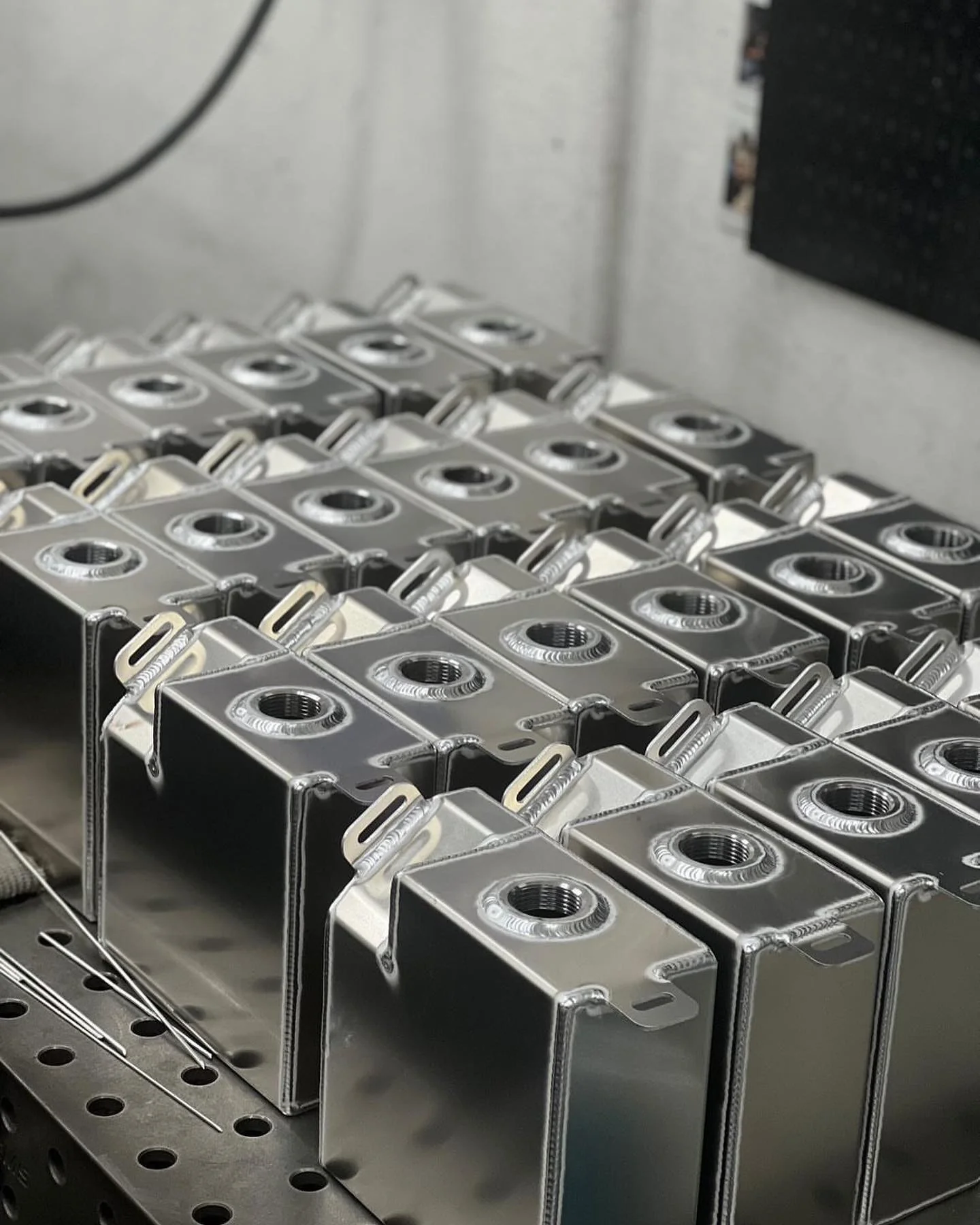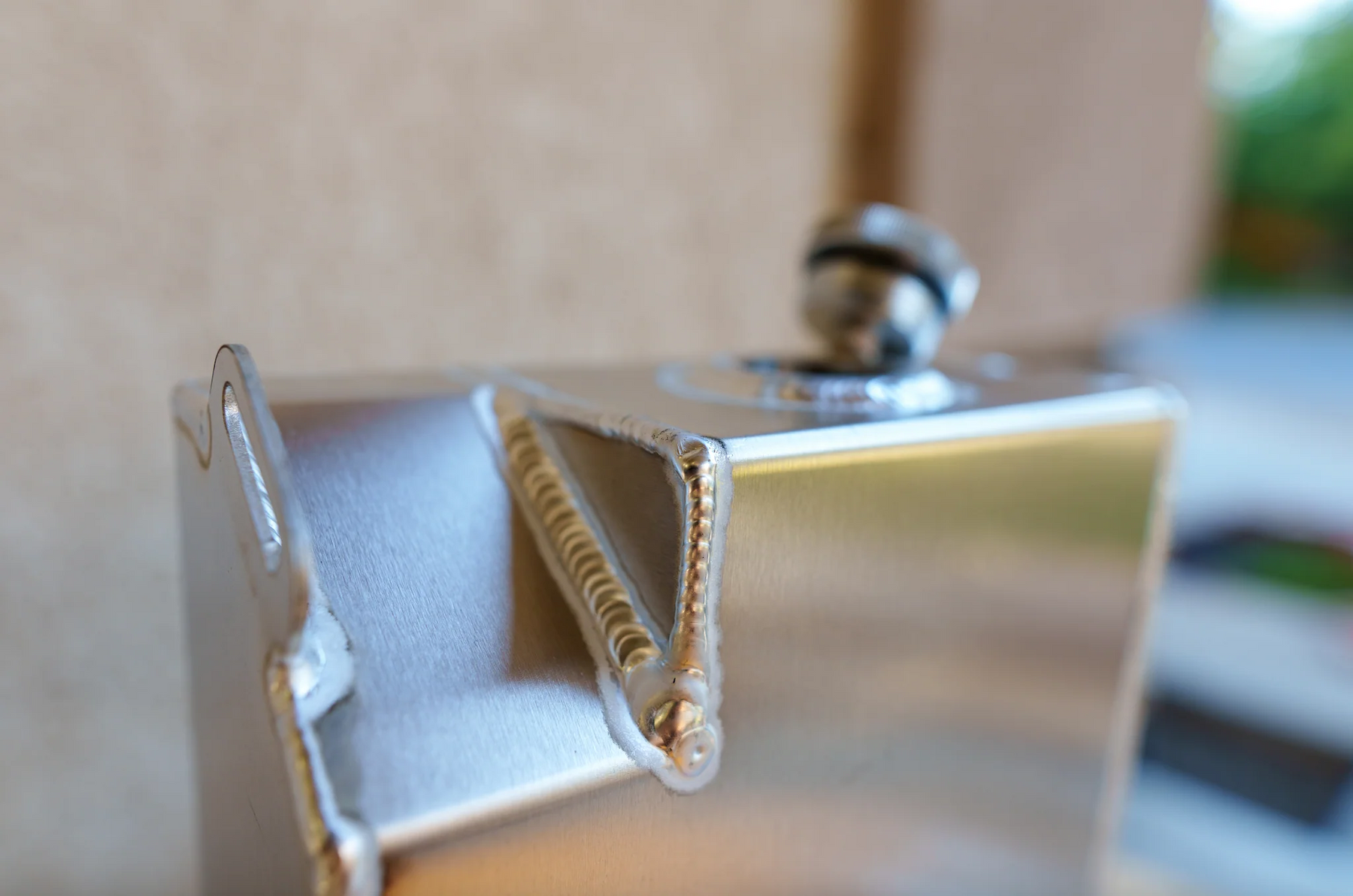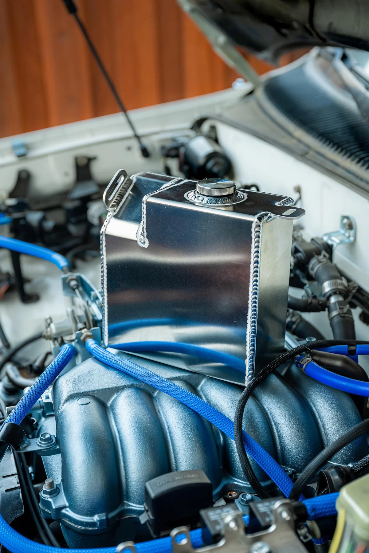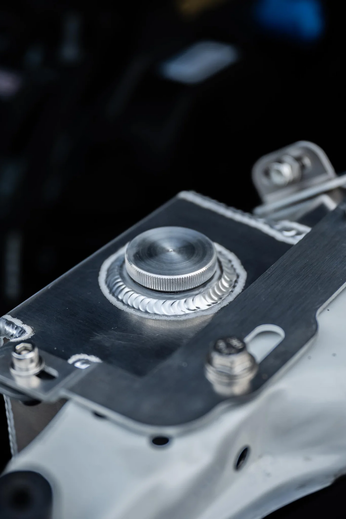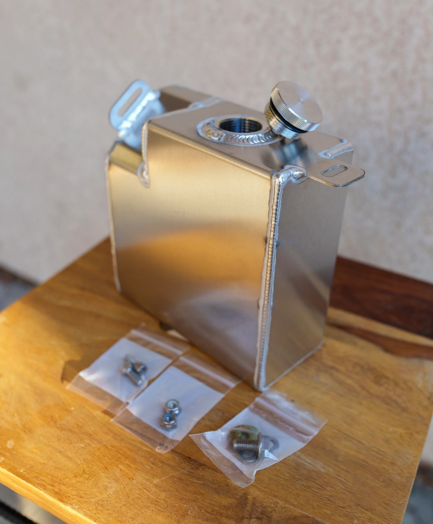 Welded together from 5052 aluminum with a custom vented billet aluminum cap made from 6061 aluminum, this reservoir utilizes every bit of room in the engine bay to maximize the amount of fluid you are able to carry.
