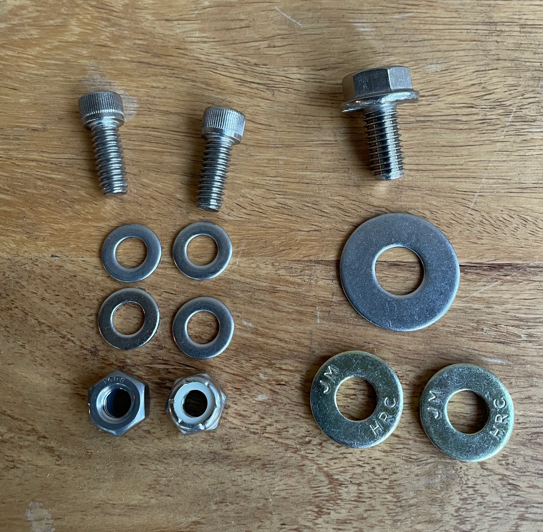 - One Thick Washer (to be used as a a spacer under the mounting bracket to account for vehicle body curvature or on the driver side mounting hole to allow for more room for the stainless socket head cap)