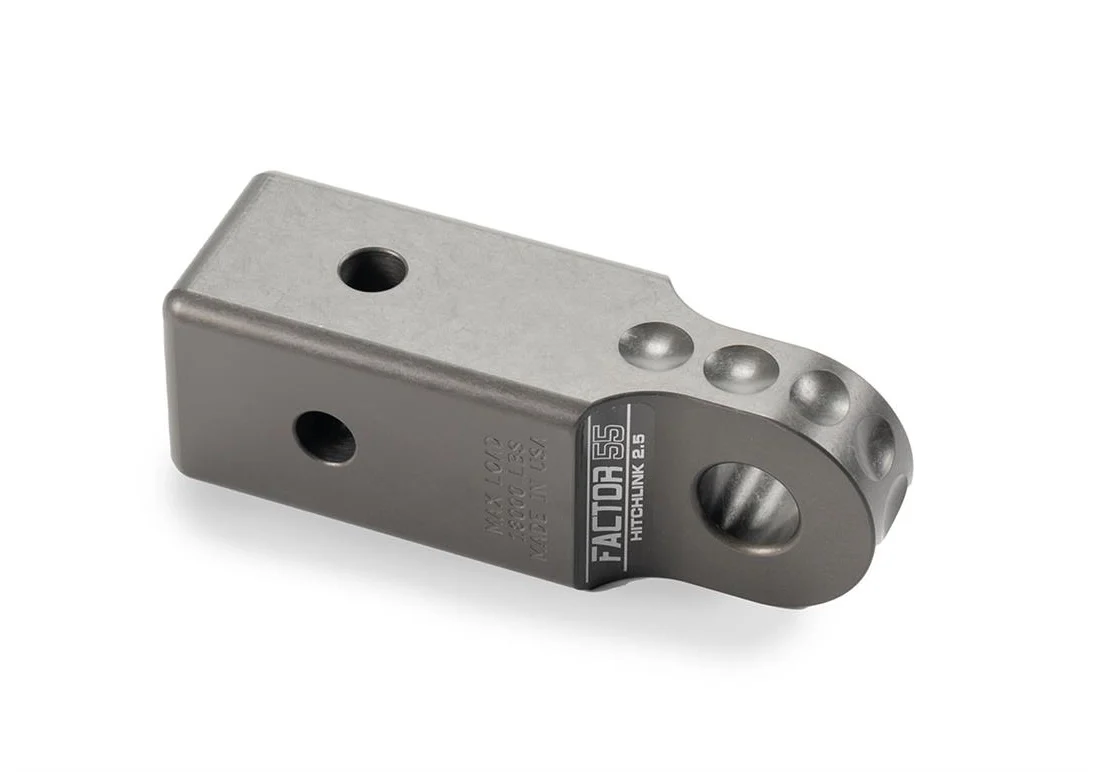 Finally a hitch receiver shackle mount designed for Class V receivers. Available in Military Specification Anodizing (Mil-A-8625 F Type III) hard anodized gray finish. The HitchLink 2.5 will accept both ¾ and 7/8 shackles and features a machined radius on the shackle mount hole for soft shackle compatibility. It can be oriented inside the hitch receiver allowing the shackle tab to be parallel to the bumper or vertical depending on its desired need. It also eliminates the need to use a receiver sleeve to downsize your receiver to a 2” adapter. Rated at 18,000 lbs. Ultimate Failure at 69,000 lbs.