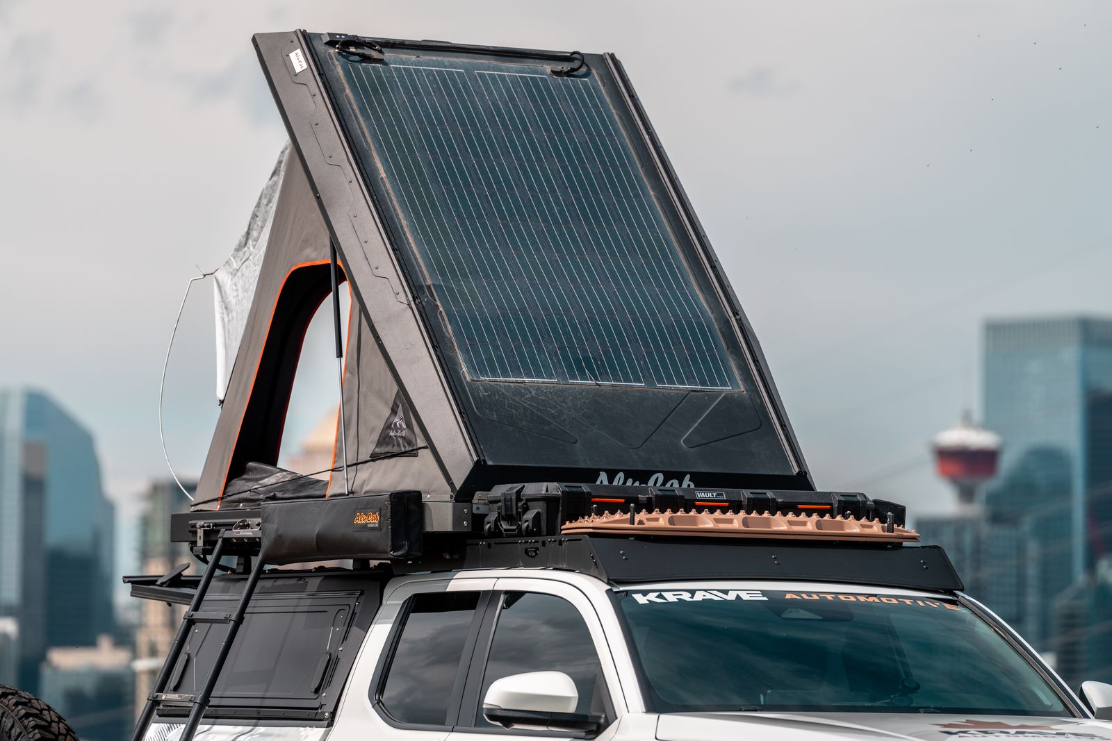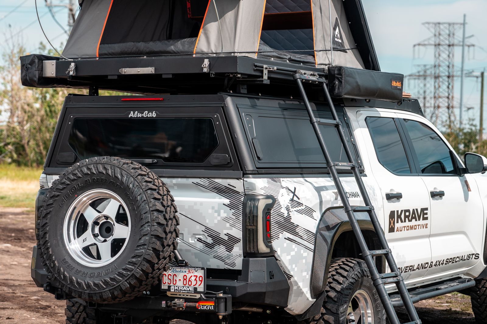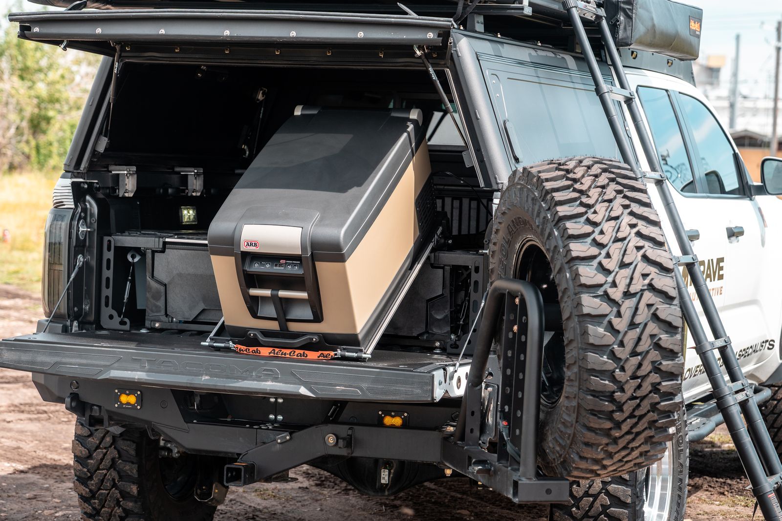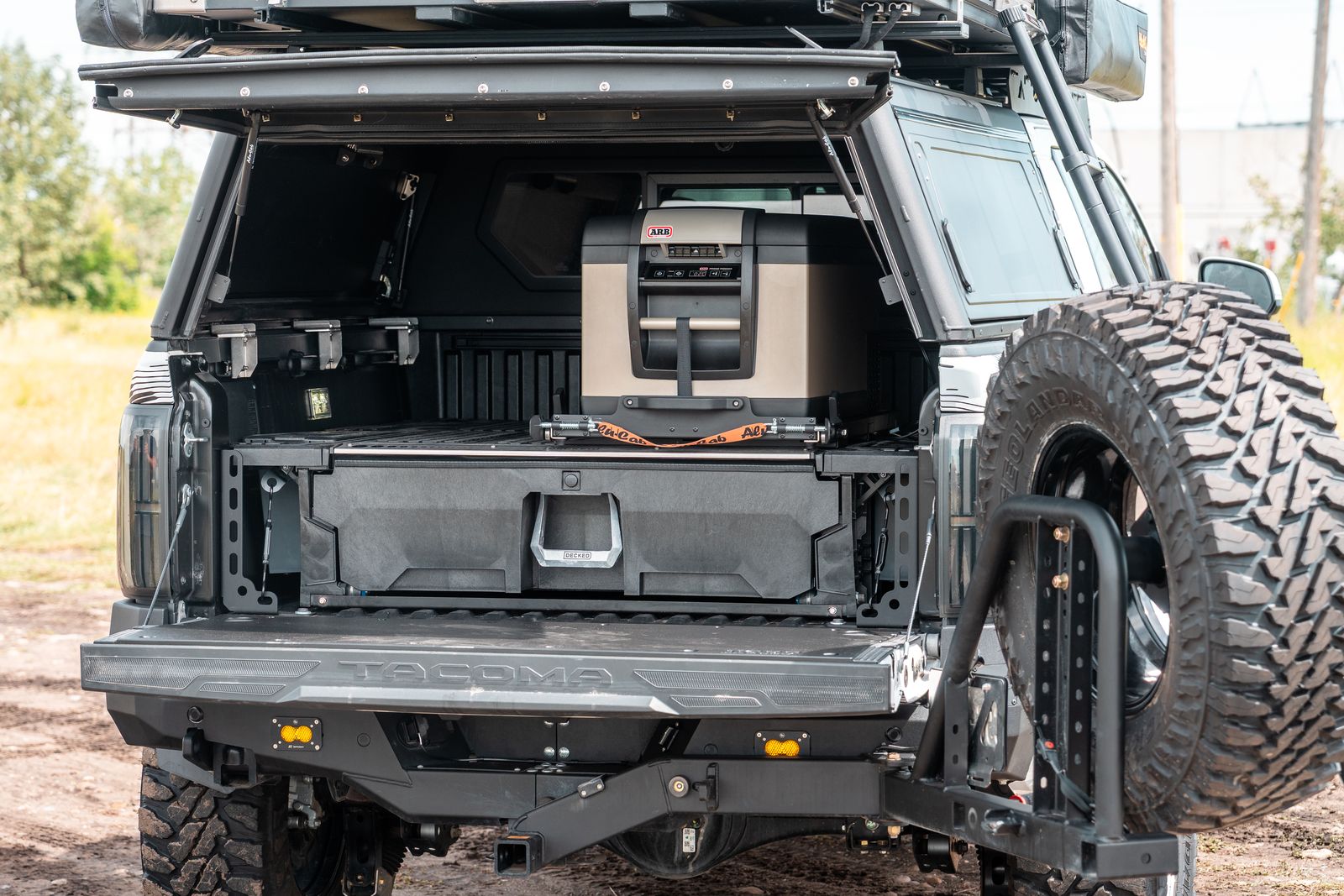 This Tacoma is fully adventure-ready with a Sherpa Rainier Roof rack and Pelican Vault case, plus a full Alucab overland system including the Gen 3-R rooftop Tent with the optional Table & Backrest, 270° Awning, Shower Cube, and Contour Canopy. The Decked drawer system, ARB 63qt fridge with tilting slide, and Rig’d UltraSwing spare tire carrier keep gear organized and accessible. Power needs are handled by a Sunflare 185W solar panel, 100Ah lithium battery, Victron DC-DC charger, solar MPPT charger, and Smart Battery Monitor — making you self-sufficient off-grid.